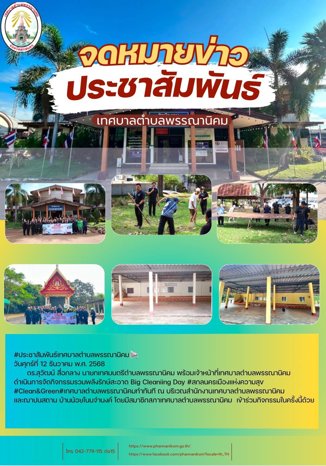 Posted in จดหมายข่าว 12.12 เริ่มทำทันทีเดินหน้าตามนโยบายท่านผู้ว่าฯ รณิดา เหลือฐิติสกุล “เมืองแห่งความสุข” ภายใต้แนวคิดสกลนครใสสะอาด ปลอดยาเสพติด – Clean & Green City มุ่งสู่การเปลี่ยนแปลงที่เห็นผลภายใน 1 ————————————————— วันศุกร์ที่ 12 ธันวาคม พ.ศ. 2568 ดร.สุวัฒน์ สื่อกลาง นายกเทศมนตรีตำบลพรรณานิคม พร้อมเจ้าหน้าที่เทศบาลตำบลพรรณานิคม ดำเนินการจัดกิจกรรมรวมพลังรักษ์สะอาด Big Cleaniing Day #สกลนครเมืองแห่งความสุข #Clean&Green#เทศบาลตำบลพรรณานิคมทำทันที ณ บริเวณสำนักงานเทศบาลตำบลพรรณานิคม และฌาปนสถาน บ้านน้อยโนนจำนงค์ โดยมีสมาชิกสภาเทศบาลตำบลพรรณานิคม เข้าร่วมกิจกรรมในครั้งนี้ด้วย #สกลนครเมืองแห่งความสุข #Clean&Green #เทศบาลตำบลพรรณานิคม admin