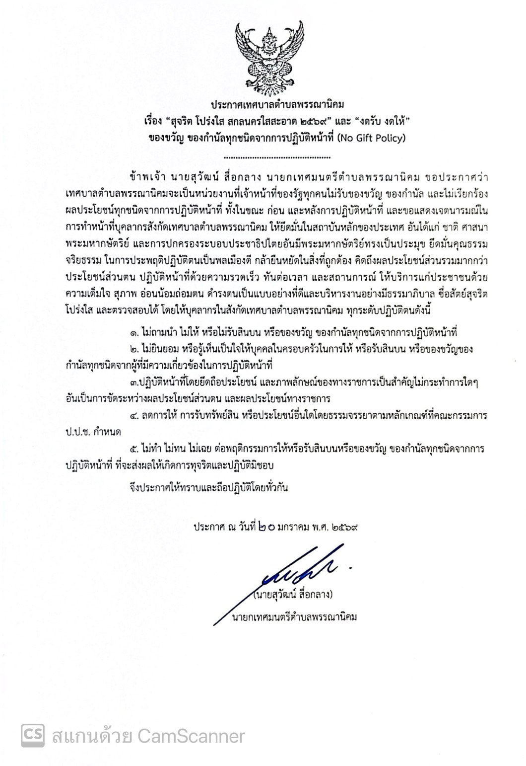 Posted in ข่าวประชาสัมพันธ์ ประกาศเทศบาลตำบลพรรณานิคม เรื่อง “สุจริต โปร่งใส สกลนครใสสะอาด 2569” และ “งดรับ งดให้” ของขวัญ ของกำนัลทุกชนิดจากการปฏิบัติหน้าที่ (No Gift Policy) admin
