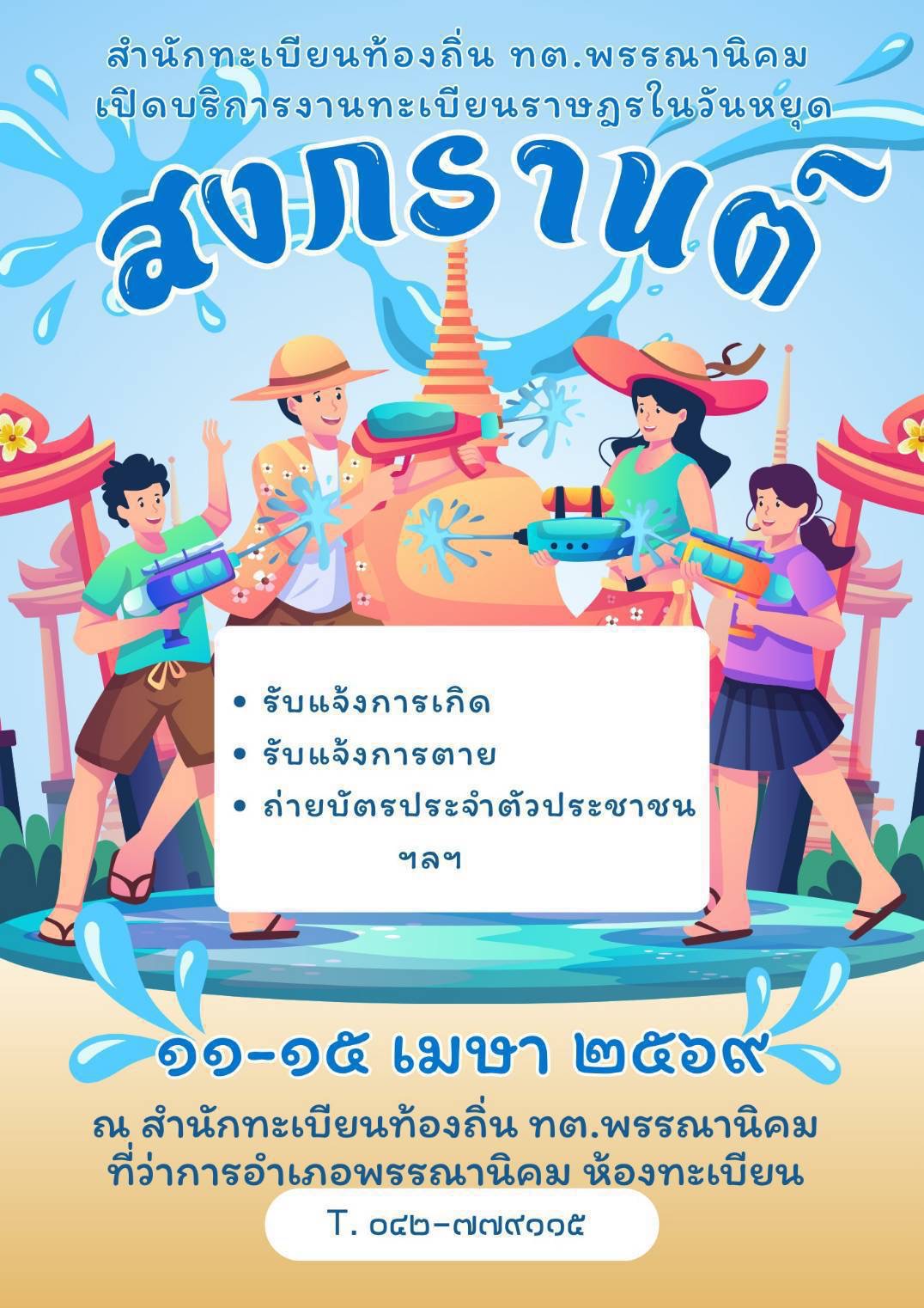 10-04-2569 เปิดบริการงานทะเบียนราษฎรในวันหยุด สงกรานต์ 08-04-2569 แจ้งเตือน ค่าฝุ่น PM 2.5 วันนี้ 8 เมษายน 2569 พื้นที่ : อำเภอพรรณานิคม 30-03-2569 ปฏิทินการเตรียมความพร้อมเพื่อจัดทำแผนพัฒนาท้องถิ่น ฉบับที่ 3 (พ.ศ. 2571-2575)