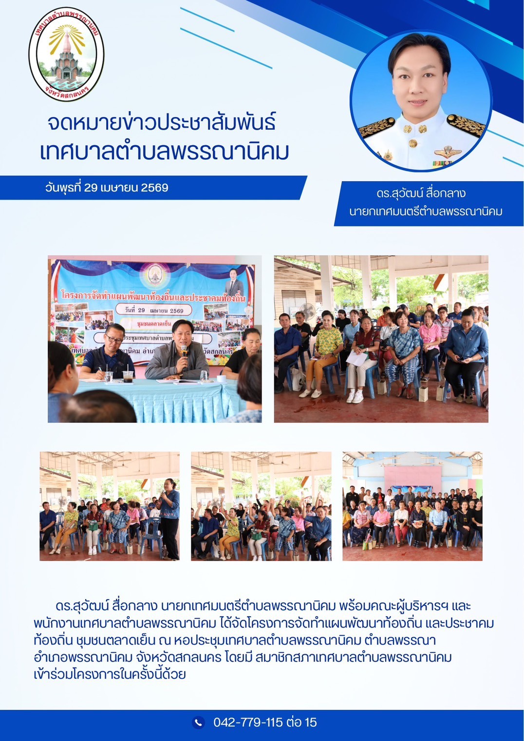 ← #ประชาสัมพันธ์เทศบาลตำบลพรรณานิคม📢 วันพุธที่ 29 เมษายน พ.ศ. 2569 ดร.สุวัฒน์ สื่อกลาง นายกเทศมนตรีตำบลพรรณานิคม พร้อมคณะผู้บริหารฯ และพนักงานเทศบาลตำบลพรรณานิคม ได้จัดโครงการจัดทำแผนพัฒนาท้องถิ่น และประชาคมท้องถิ่น ชุมชนตลาดเย็น ณ หอประชุมเทศบาลตำบลพรรณานิคม ตำบลพรรณา อำเภอพรรณานิคม จังหวัดสกลนคร โดยมี สมาชิกสภาเทศบาลตำบลพรรณานิคม เข้าร่วมโครงการในครั้งนี้ด้วย