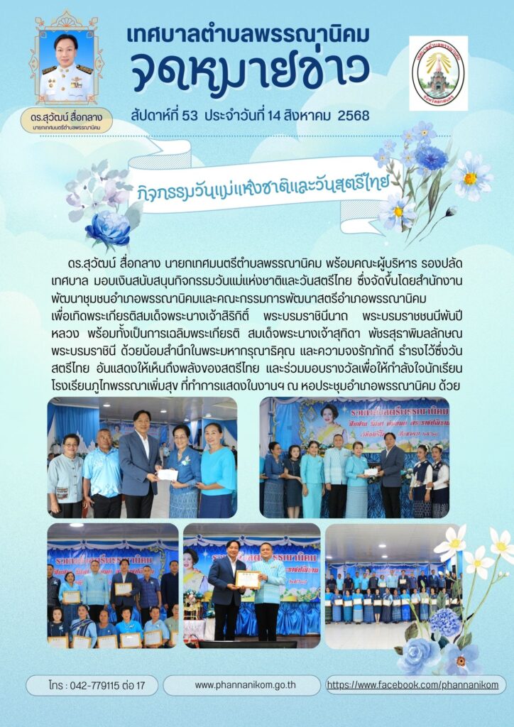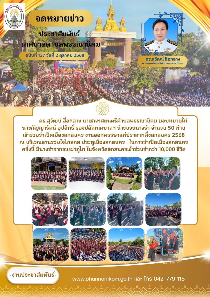 ดร.สุวัฒน์ สื่อกลาง นายกเทศมนตรีตำบลพรรณานิคม มอบหมายให้ นางกัญญารัตน์ อุปสิทธิ์ รองปลัดเทศบาลฯ นำขบวนนางรำ จำนวน 50 ท่าน เข้าร่วมรำเปิดเมืองสกลนคร งานออกพรรษาแห่ปราสาทผึ้งสกลนคร 2568 ณ บริเวณลานรวมใจไทสกล ประตูเมืองสกลนคร ในการรำเปิดเมืองสกลนคร ครั้งนี้ มีนางรำจากชนเผ่าภูไท ในจังหวัดสกลนครเข้าร่วมรำกว่า 10,000 ชีวิต17 ตุลาคม 2568